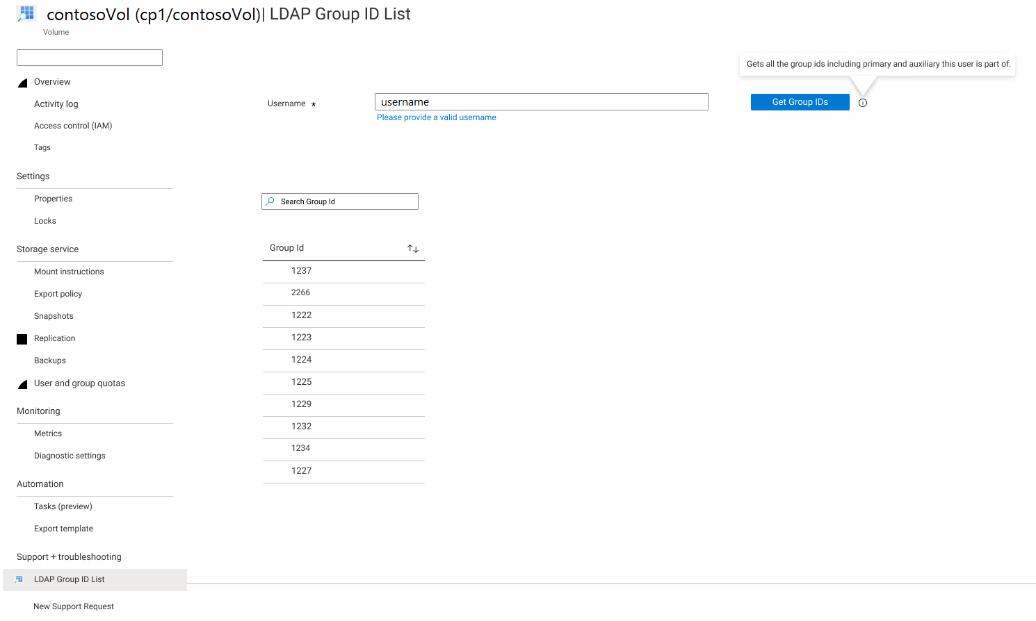 在启用了 LDAP 的卷的卷页中,在“支持和故障排除”下选择“LDAP 组 ID 列表”。