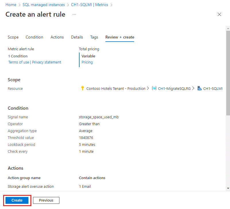 Field Description 检查间隔 选择警报规则检查条件是否满足的频率。 回溯期 选择回溯期,即每次检查数据时要回溯的时间段。 例如,每隔 1 分钟查看过去的 5 分钟。 在屏幕截图中显示的示例中,值 1,840,876 MB 用于表示阈值为 1.8 TB。 由于示例中的操作符设置为“大于”,所以如果 SQL 托管实例上的存储空间消耗量超过 1.8 TB,就会触发警报。 存储空间指标的阈值必须以 MB 表示。