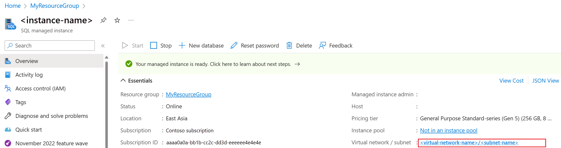 转到 Azure 门户中 的 SQL 托管实例,然后选择子网以打开 “子网 ”页。