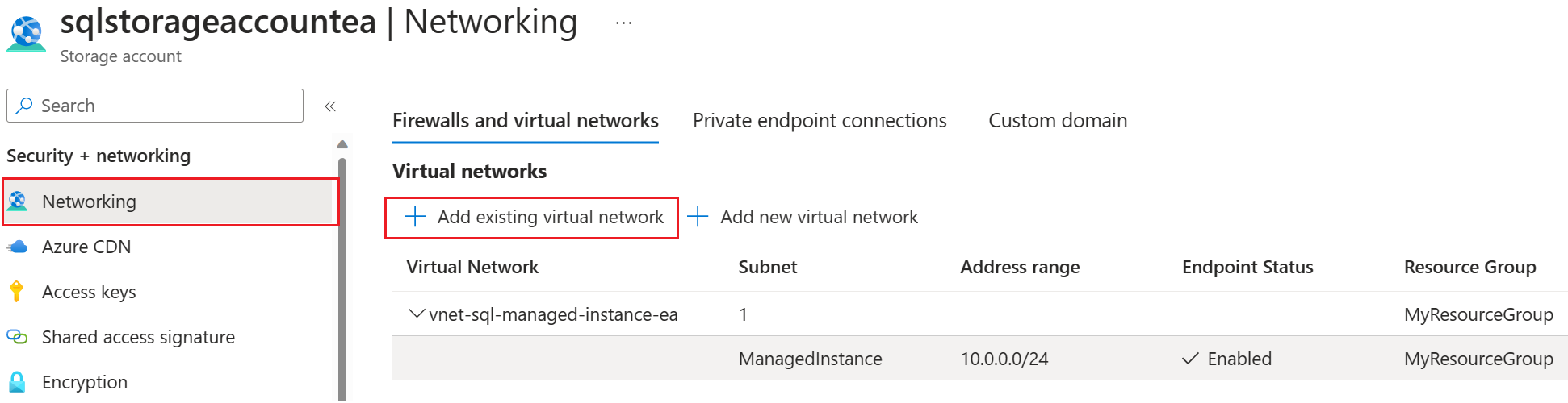 从下拉列表菜单中选择相应的订阅、虚拟网络和托管实例子网,然后选择“ 添加 ”,将 SQL 托管实例的虚拟网络添加到存储帐户。