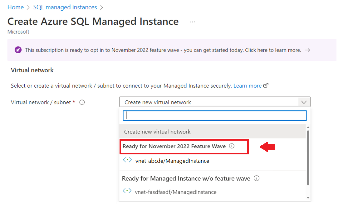 在符合条件的订阅中,“创建 Azure SQL 托管实例”页会显示“2022 年 11 月功能波次适用于此订阅”消息: