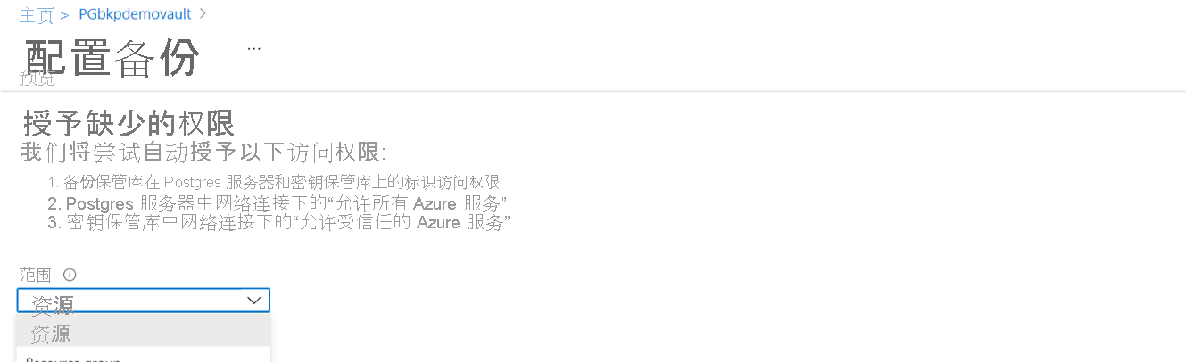 在操作菜单上选择“分配缺少的角色”,然后分配角色。 进程启动后,将向备份保管库授予对密钥保管库和/或 Azure Database for PostgreSQL 服务器的缺失访问权限。 在 “范围” 区域中,可以定义应向其授予访问权限的范围。 该操作完成后,将开始重新验证。