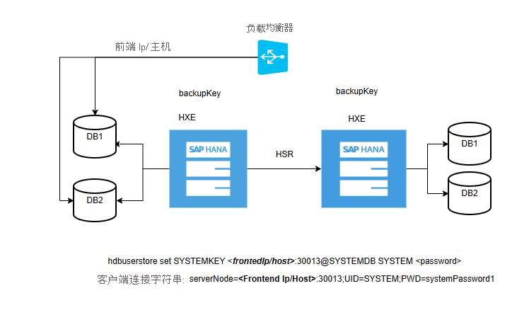 hdbuserstore set SYSTEMKEY localhost:30013@SYSTEMDB <custom-user> '<some-password>' hdbuserstore set SYSTEMKEY <load balancer host/ip>:30013@SYSTEMDB <custom-user> '<some-password>'在两个 VM/节点上创建相同的自定义备份用户(具有相同的密码)和密钥(在 hduserstore 中)。