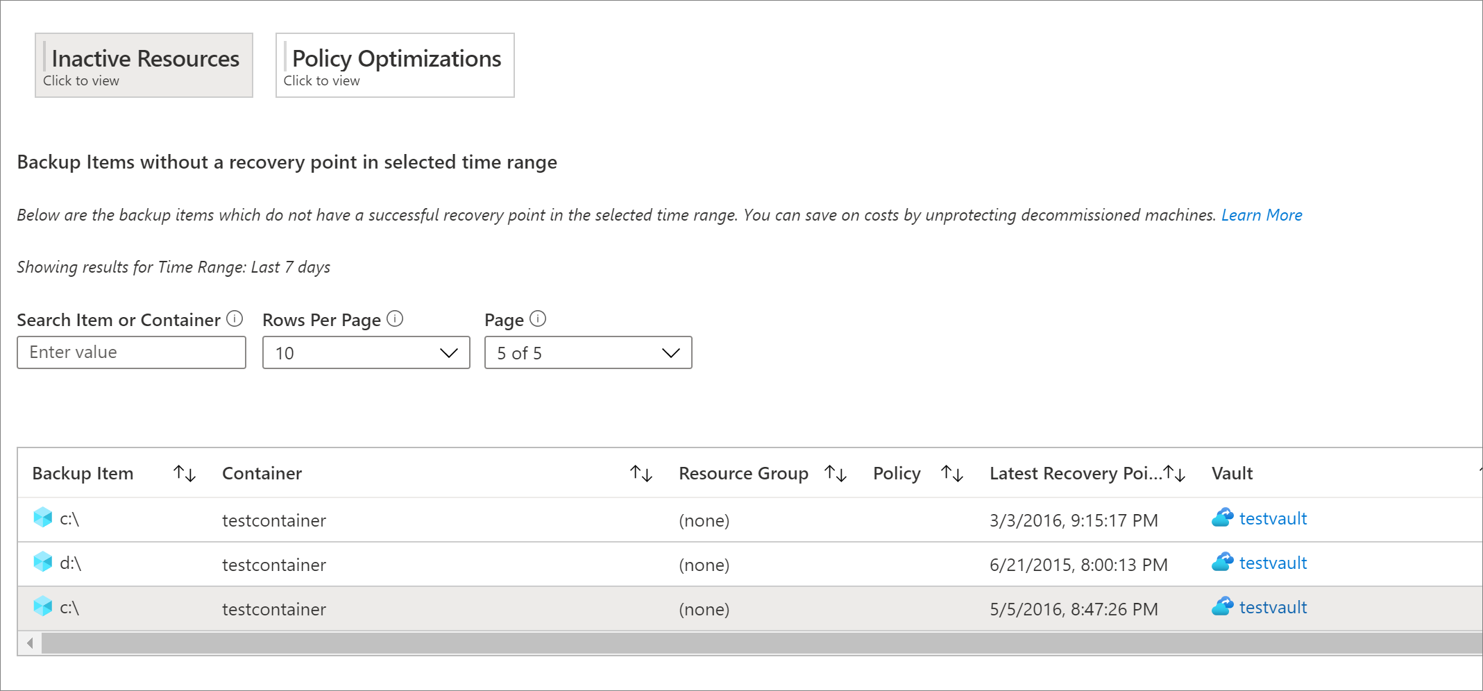 使用此选项卡可查看备份的潜在成本优化机会。 目前,“优化”选项卡可针对以下场景提供见解: