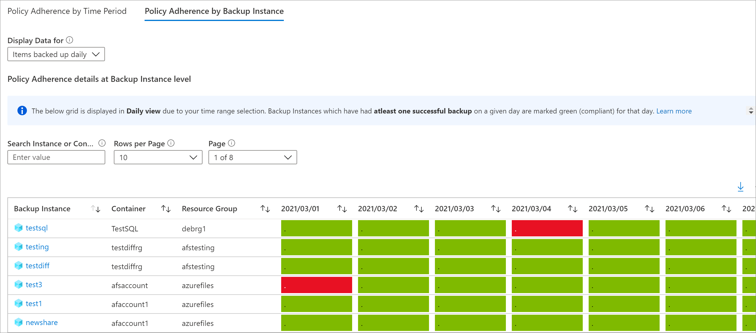 策略遵循:使用此选项卡,可以确定所有备份实例是否每天都至少有一次成功备份。 对于使用每周备份策略的项,可以使用此选项卡来确定所有备份实例是否每周至少有一次成功备份。