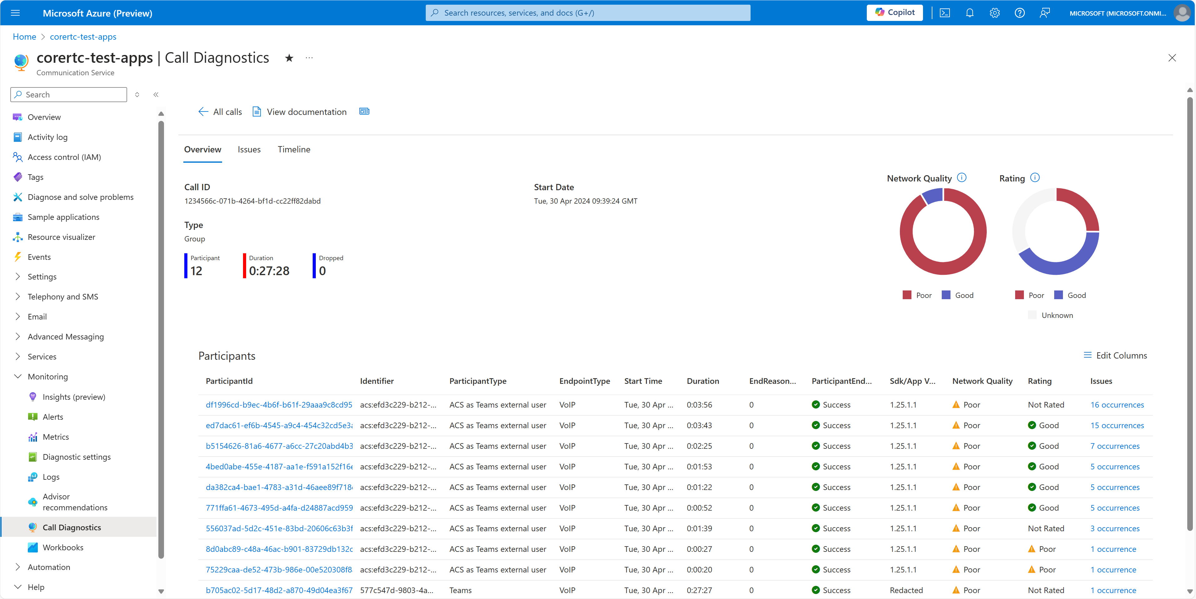 为了提供良好的客户体验,了解通话质量和可靠性非常重要。 有各种问题会影响通话质量,例如 Internet 连接不佳、软件兼容性问题和设备技术问题。 这些问题对于所有通话参与者来说都是令人沮丧的,无论是签入后等待医生电话的患者,还是正在与老师上课的学生。 对于开发人员而言,诊断和解决这些问题可能非常耗时。