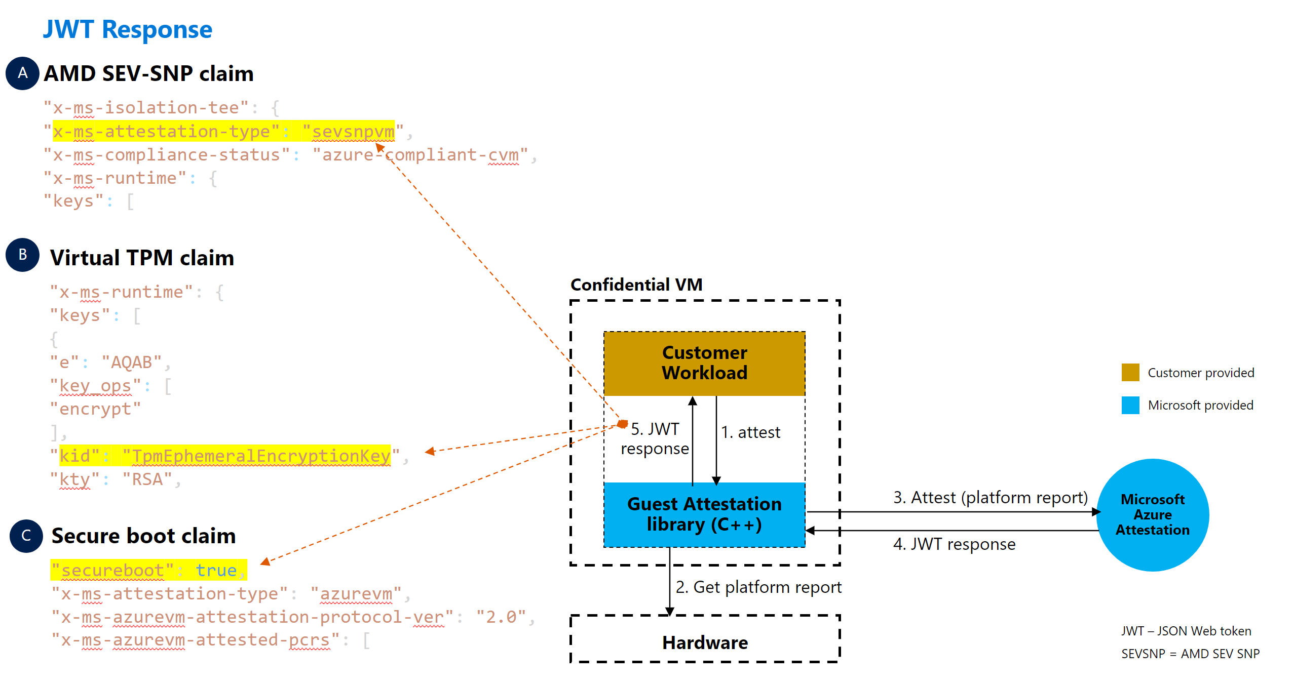 客户工作负载必须与证明库集成并在机密 VM 内部运行。 在客户工作负载向证明库发出请求后,客户工作负载将分析响应,以确定 VM 是否在正确的硬件平台上运行和/或完全设置敏感工作负载之前指定了安全启动设置。