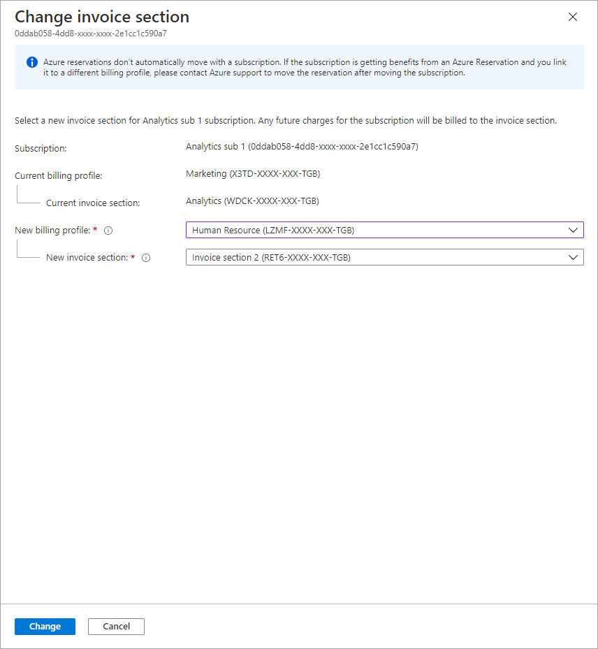 如果你有现有的 Azure 订阅或其他产品(例如 Azure 市场和应用源资源),可将其从现有发票科目移到另一个发票科目,以重新组织成本。 但是,不能更改预留、节省计划或基于席位的订阅的发票科目。 或者,可以启动转移请求来管理其他 Azure 产品,包括预留和储蓄计划。 请参阅 将 Azure 产品计费所有权转让给Microsoft客户协议 - Microsoft成本管理