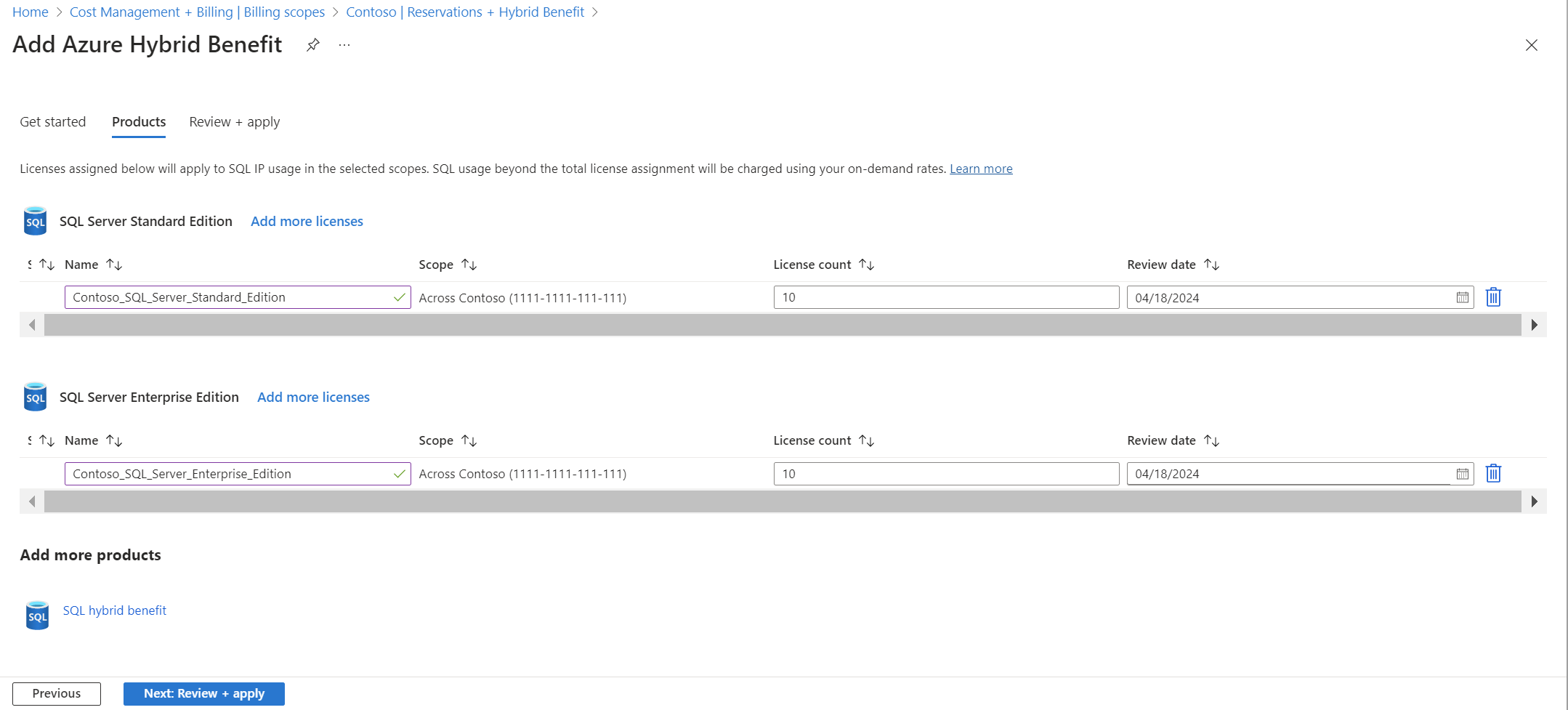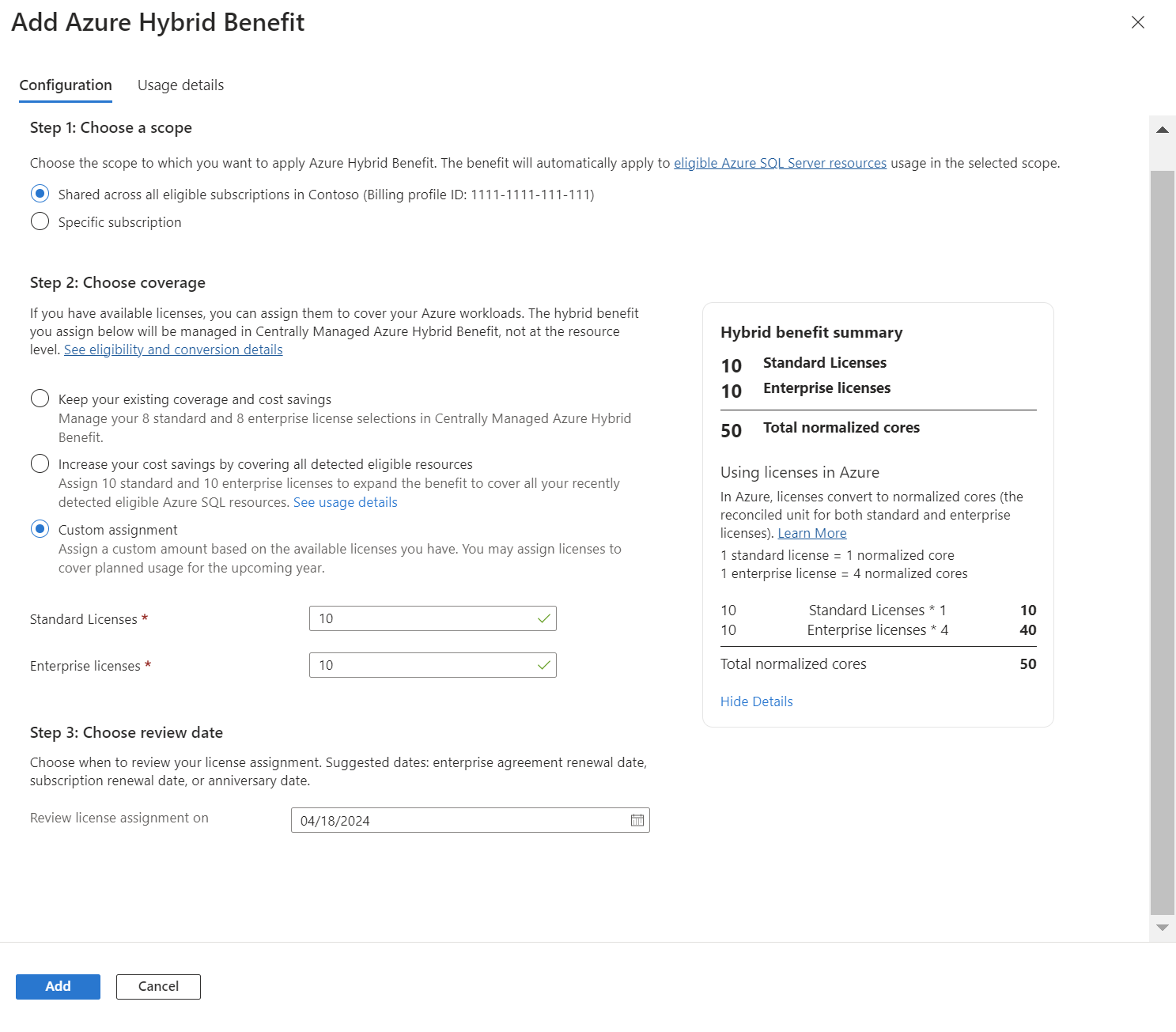 - 如果其他资源使用所有许可证,则为混合权益配置的特定资源可能无法获得折扣。 但是,最大折扣根据许可证计数应用于范围。 有关如何应用折扣的详细信息,请参阅 什么是 SQL Server 的集中管理的 Azure 混合权益?
