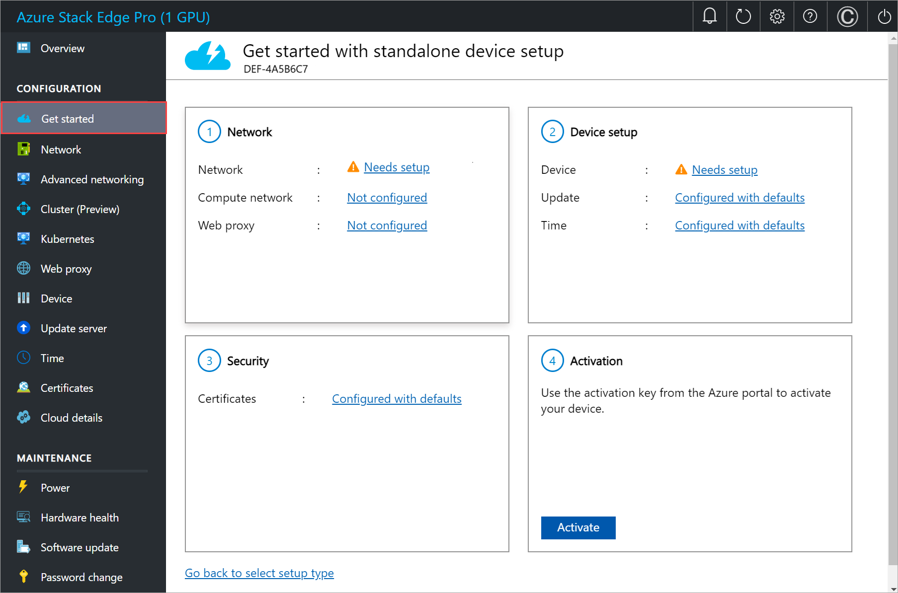 “入门”页显示了使用 Azure Stack Edge 服务配置和激活物理设备所需的各种设置。