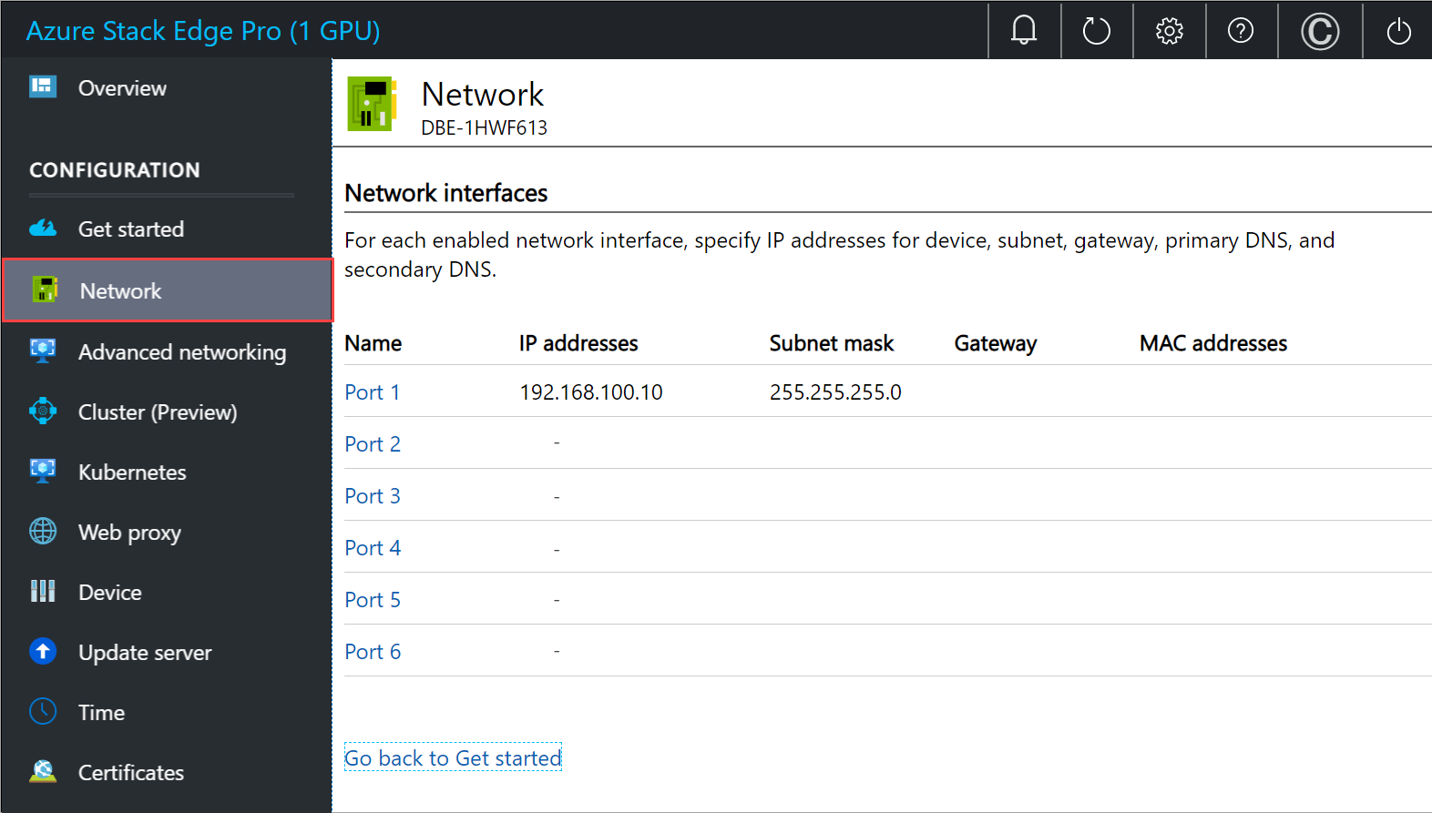 本教程介绍如何通过本地 Web UI,使用板载 GPU 为 Azure Stack Edge Pro 设备配置网络。