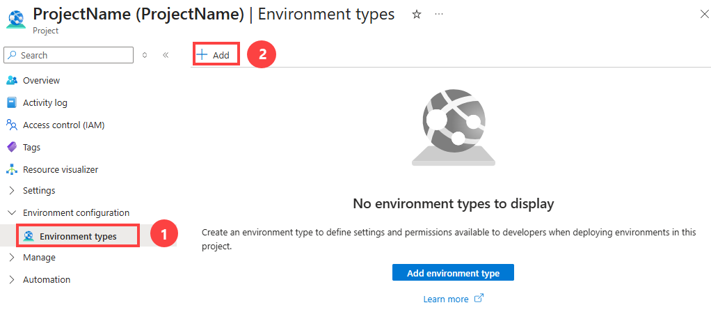 你添加到开发人员中心的环境类型在开发人员中心的每个项目中都可用,但默认情况下不启用环境类型。 在项目级别启用环境类型时,环境类型将确定用于部署环境的托管标识和订阅。