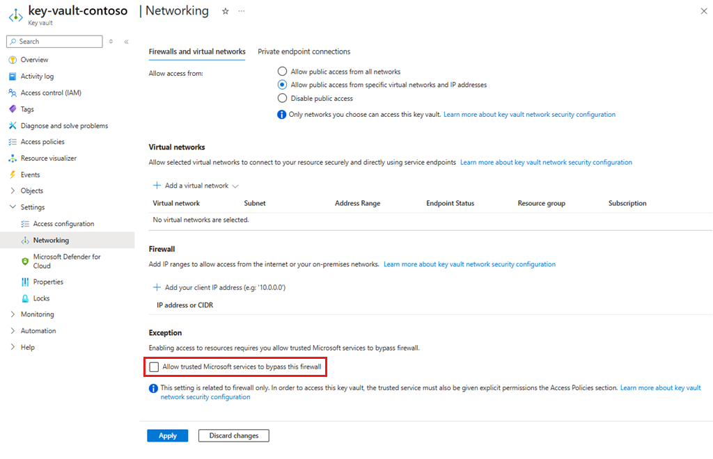 若要详细了解如何让受信任的Microsoft服务绕过防火墙,请参阅 配置 Azure Key Vault 网络设置。
