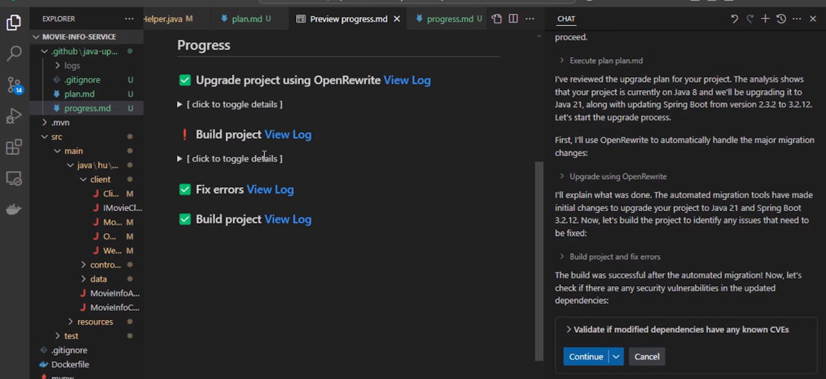 然后,GitHub Copilot 继续执行项目的代码转换阶段。 它使用名为 OpenRewrite 的开源工具根据特定食谱实现一些代码更改。 然后,AI 通过动态生成/修复循环解决剩余问题。 可以通过随时检查 progress.md markdown 文件来监视 Visual Studio Code 编辑器区域中的进度。
