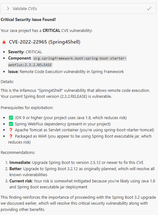validate_cves_for_java扫描项目以查找已知的与 Java 相关的常见漏洞和暴露(CVE),并验证是否解决了关键漏洞。