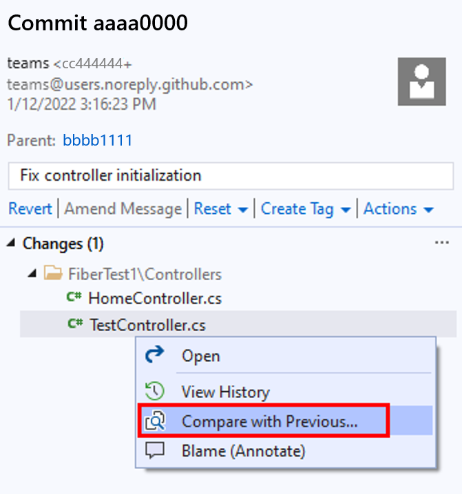 在发布之前,最好评审提交中的代码更改。 Visual Studio 提供差异视图,可帮助查看自上次提交以来所做的所有更改。