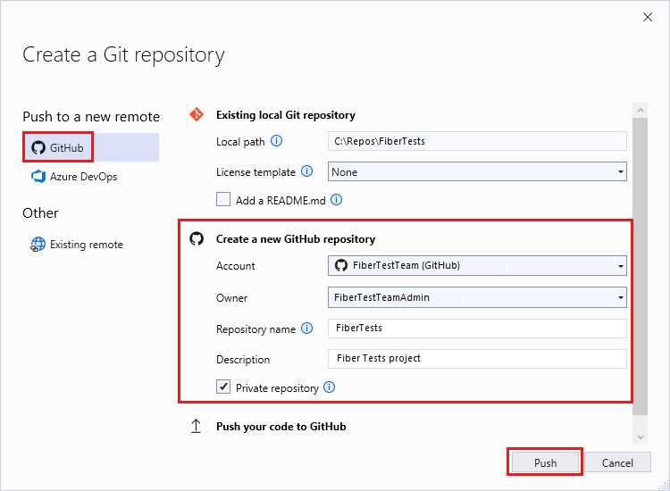 在“创建 Git 存储库”对话框中,选择“GitHub”。 在“创建新的 GitHub 存储库”下输入任何必需值。 然后选择“推送”。