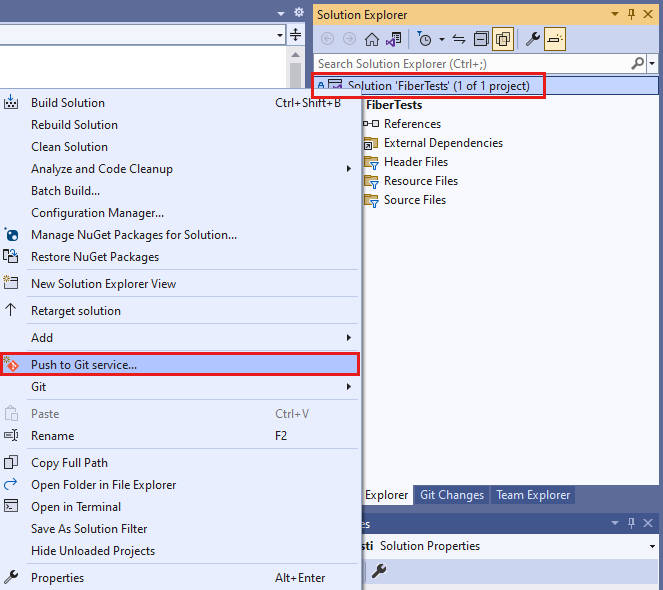 通过右键单击解决方案资源管理器中的解决方案名称,然后选择“推送到 Git 服务”以启动“创建 Git 存储库”窗口,连接到 Azure DevOps 存储库。