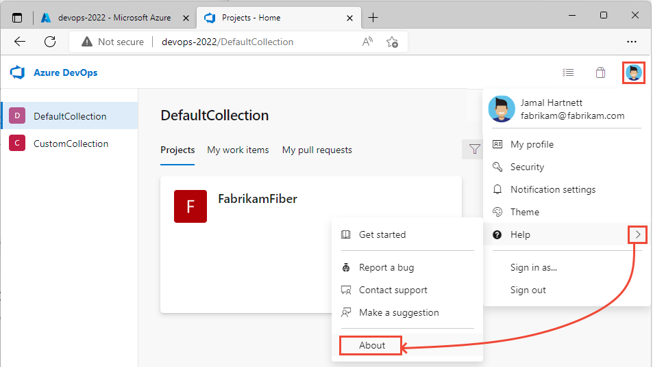 屏幕截图,显示如何从 Azure DevOps 中的用户配置文件菜单打开 Azure DevOps Server 的“关于”页。