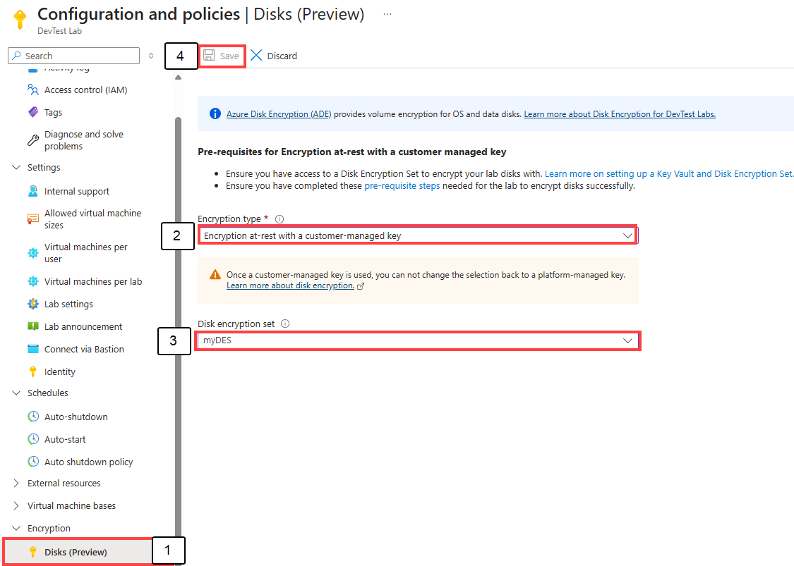 在 Azure 开发测试实验室中,实验室中创建的所有 OS 磁盘和数据磁盘都通过平台管理的密钥进行加密。 但是,作为实验室所有者,可以选择使用自己的密钥管理实验室虚拟机磁盘的加密。 如果选择使用自己的密钥管理加密,则可以指定用于加密实验室磁盘中的数据 的客户管理的密钥 。 若要详细了解使用客户管理的密钥的 SSE 和其他托管磁盘加密类型,请参阅 客户管理的密钥。 另请参阅 使用客户管理的密钥的限制。