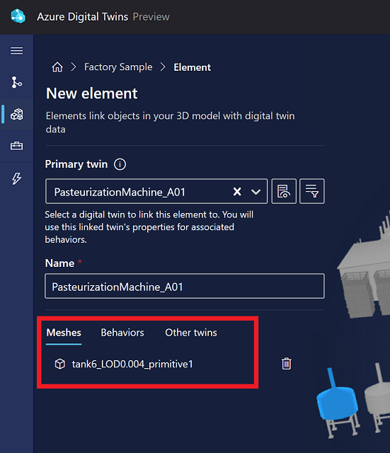 主要孪生是元素的主数字孪生对应组件。 将元素连接到你的 Azure 数字孪生实例中的孪生,使该元素可以在 3D 可视化效果中表示你的孪生及其数据。