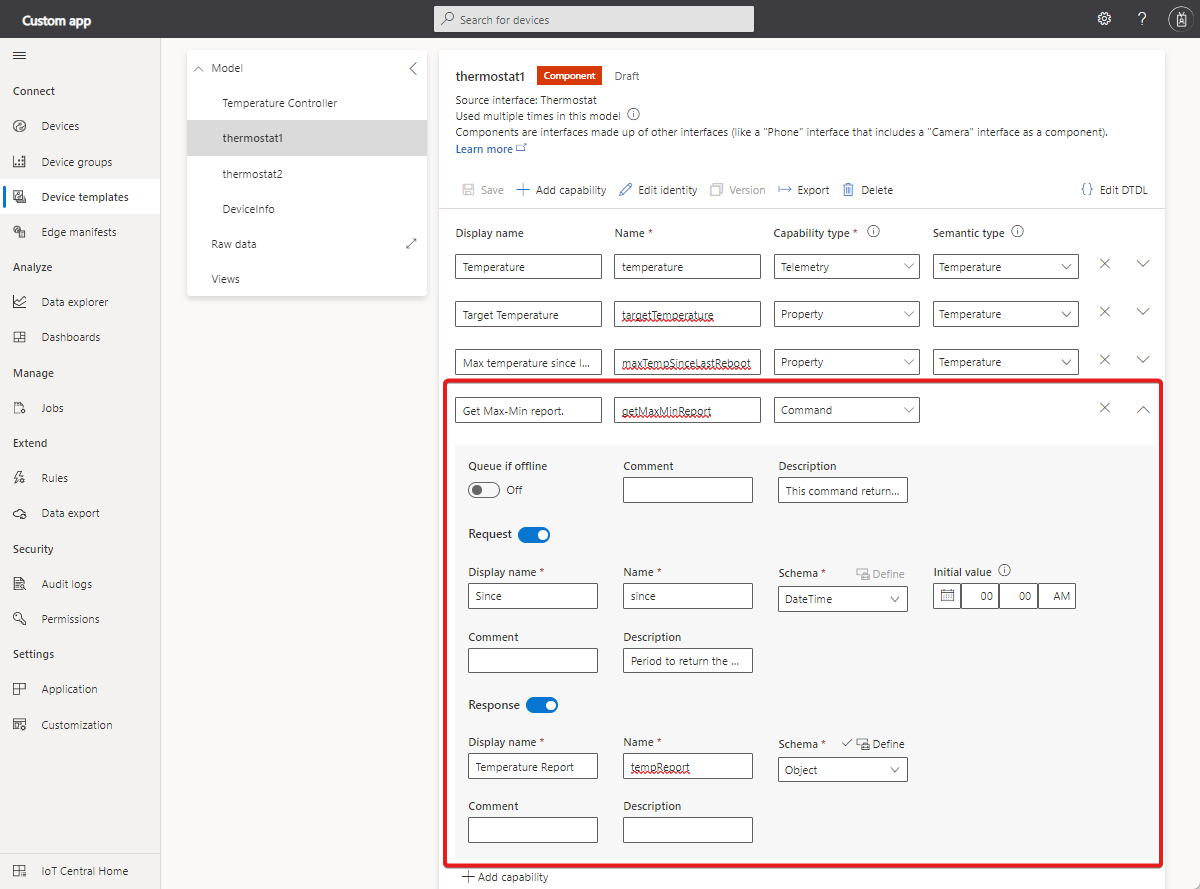 命令定义为设备模板的一部分。 以下屏幕截图显示了恒温器设备模板中的“获取 Max-Min 报表”命令定义。 此命令具有请求和响应参数: