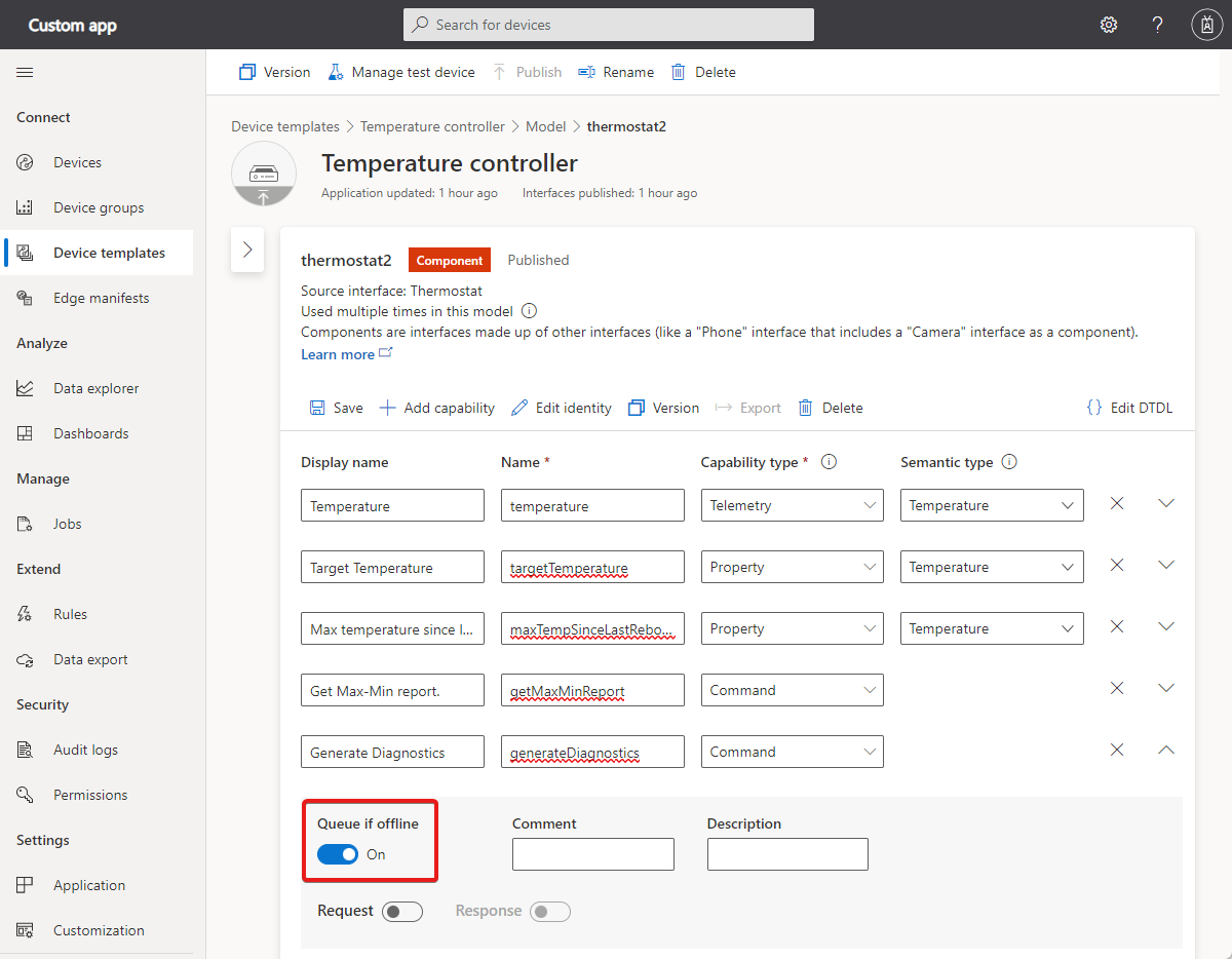 默认情况下,命令要求设备已连接,如果无法访问设备,则失败。 如果在设备模板 UI 中选择“离线时排队”选项,则命令可以在设备上线之前排队。 本文后面的单独部分介绍了这些 脱机命令 。