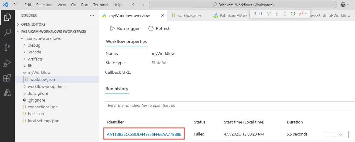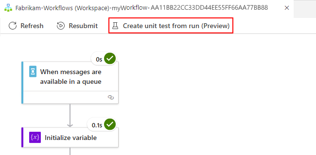 在概述页中,在运行历史记录下,选择用于创建单元测试的工作流运行。