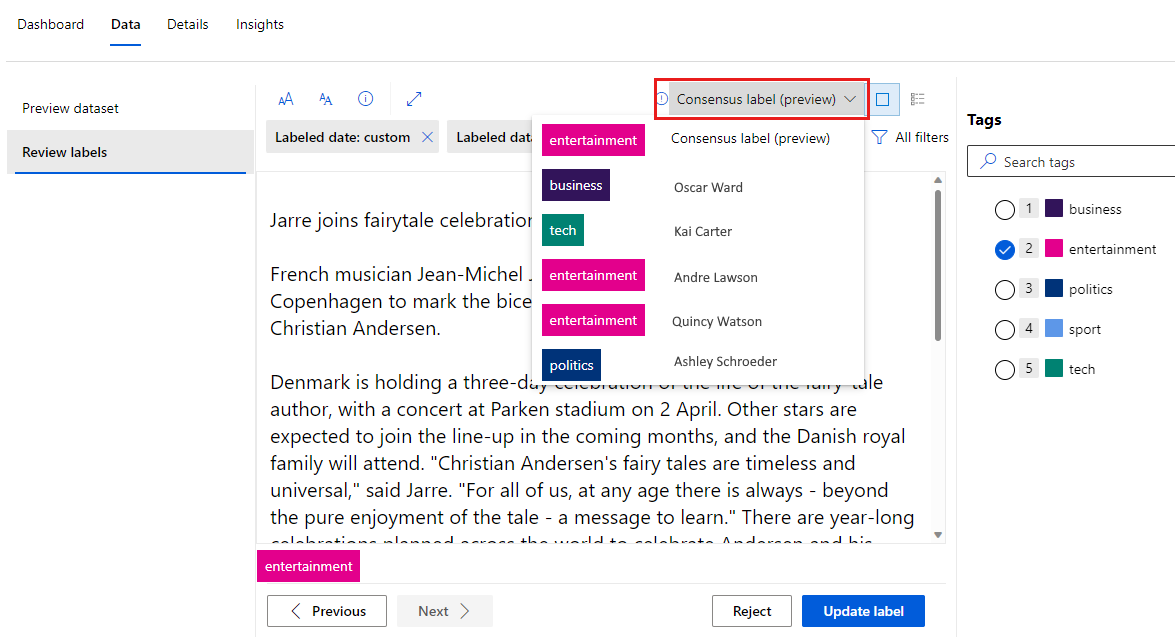 滚动已标记的数据以查看标签。 如果发现数据标记不正确,可以选择该数据,然后选择“拒绝”以删除标签,并将数据返回到未标记队列中。