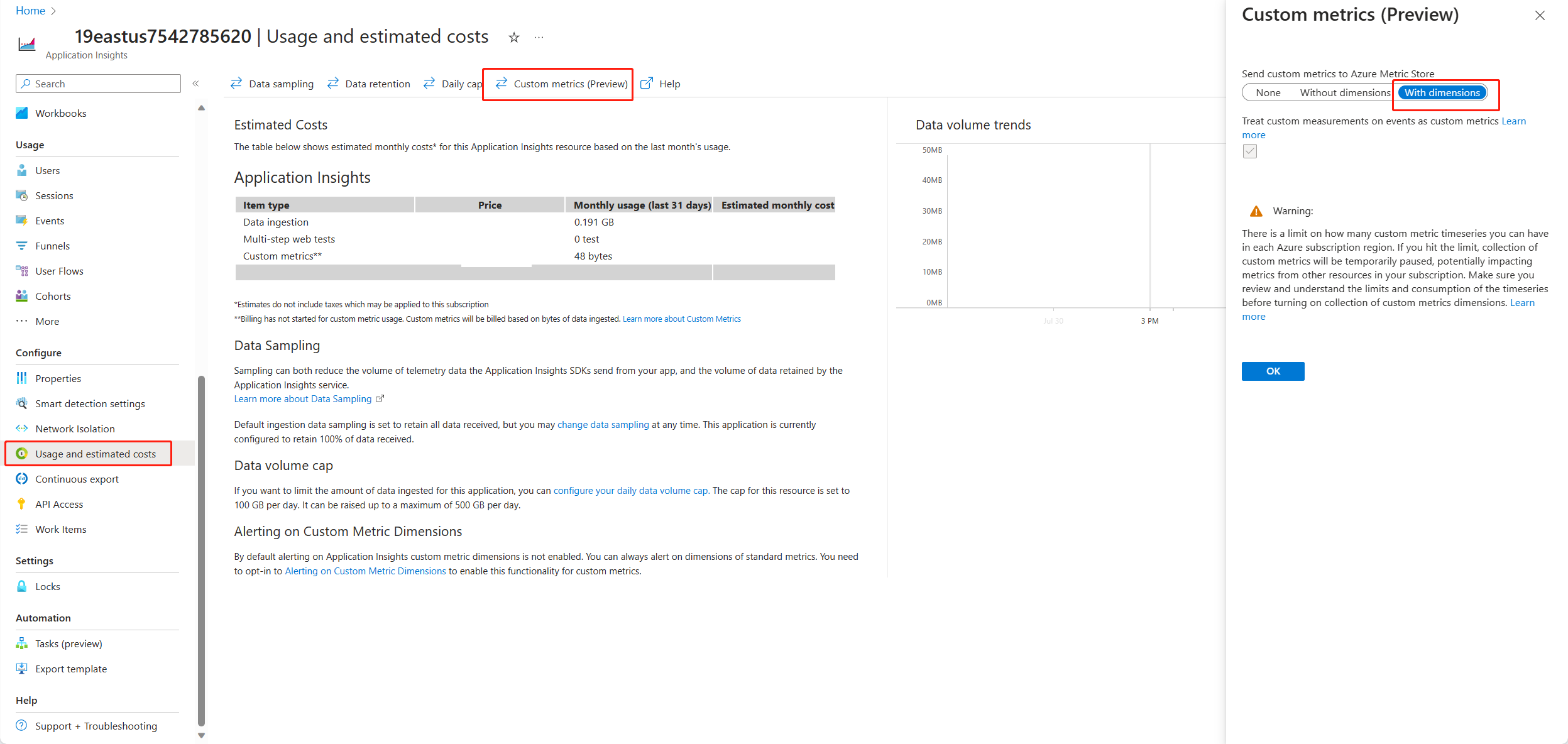 打开 Application Insights,然后从左侧导航中选择“使用情况和预估成本”。 选择“自定义指标(预览版)”,然后选择“使用维度”并保存更改。
