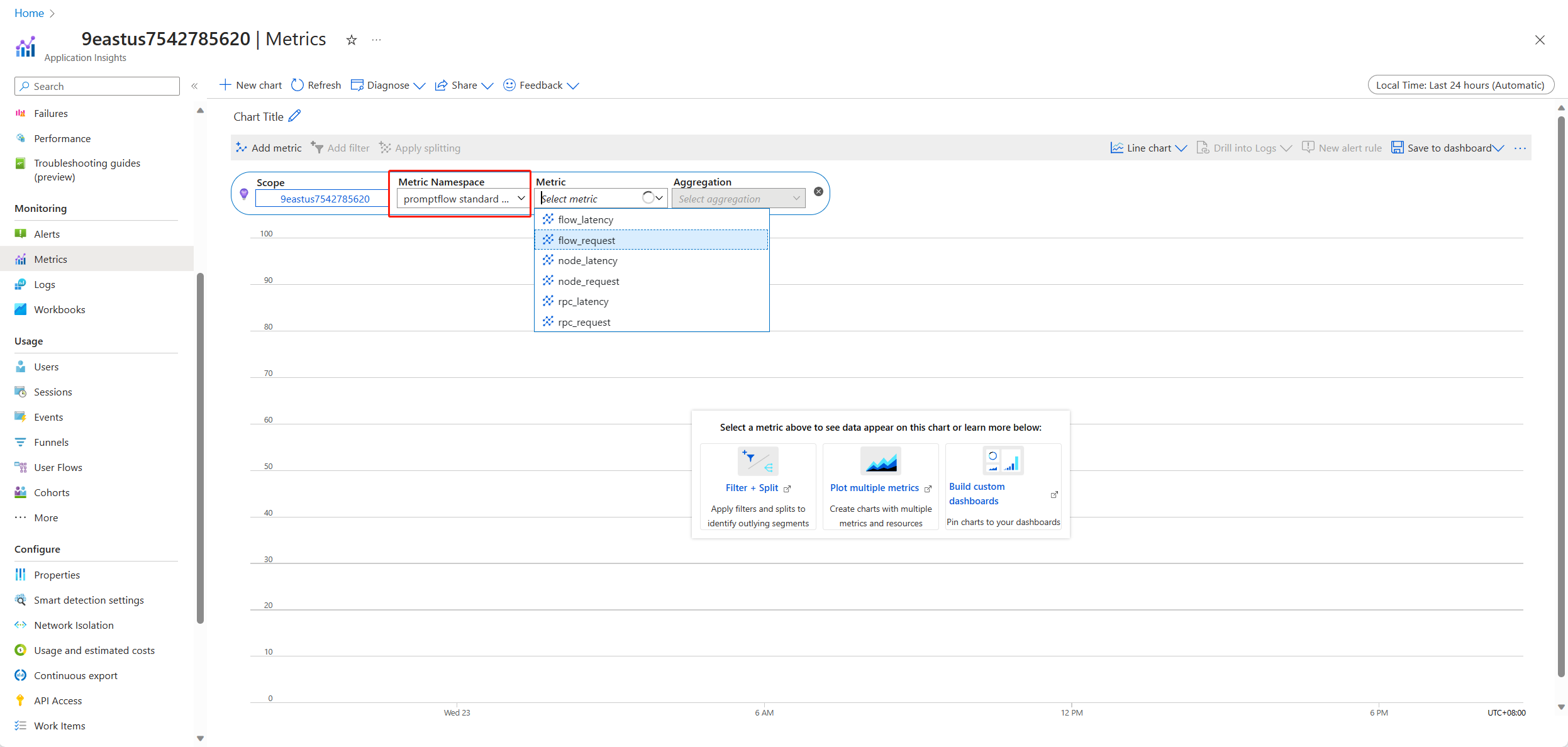 在左侧导航中选择“指标”选项卡。 从“指标命名空间”中选择“promptflow 标准指标”,然后可以使用不同的聚合方法从“指标”下拉列表中浏览指标。
