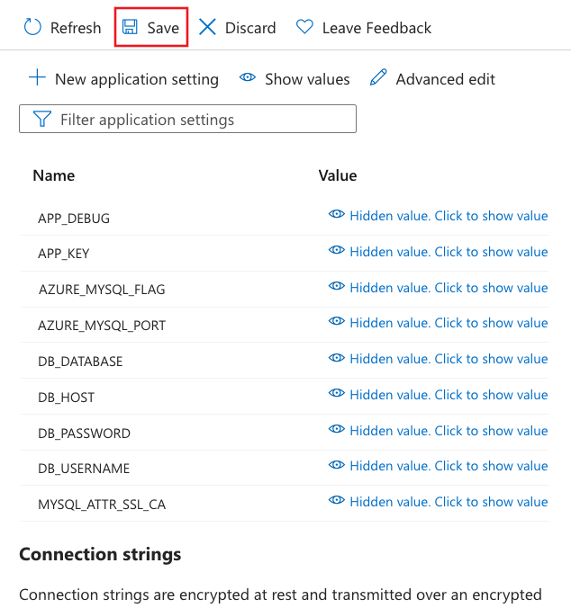 - 使用应用设置将连接机密配置到 MySQL