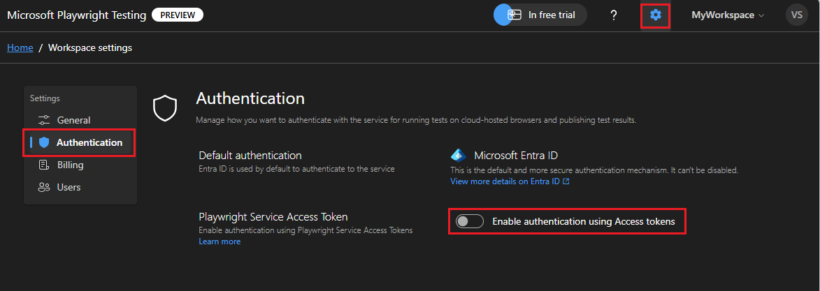 Microsoft Playwright Testing 服务也支持使用访问令牌进行身份验证。 该身份验证方法的安全性较低。 我们建议使用 Microsoft Entra ID 向该服务进行身份验证。