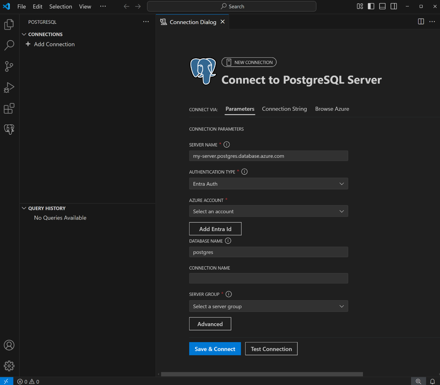 • 如果已安装并运行 Visual Studio Code,PostgreSQL 扩展的连接对话框将自动启动。