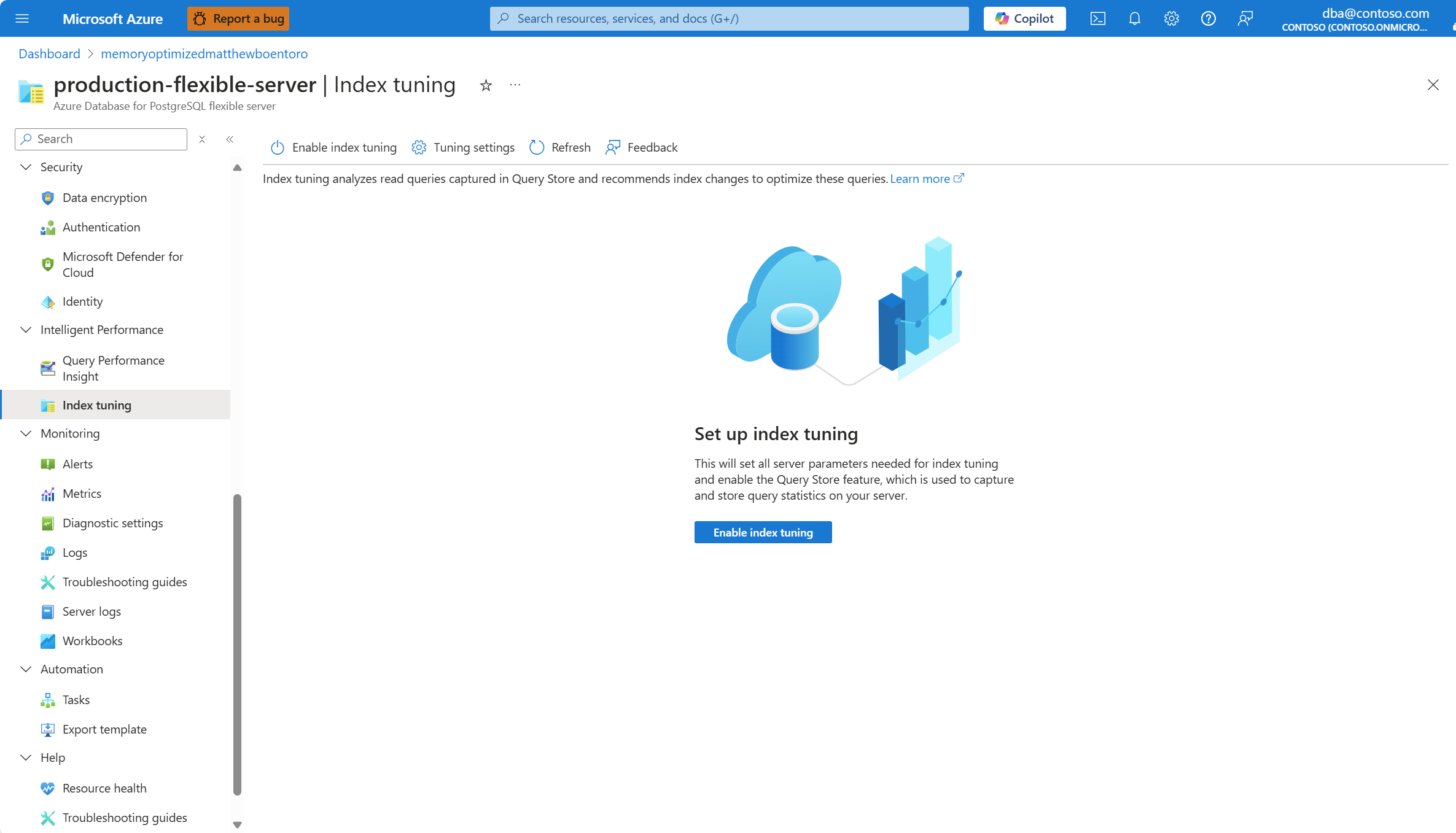 3. 如果 pg_qs.query_capture_mode 设置为 NONEindex_tuning.mode 设置为 OFF,则“索引优化”页将提供启用索引优化的选项。 如果已禁用查询存储,请选择两个“启用索引优化”按钮之一,启用索引优化功能及其所需的查询存储依赖项。