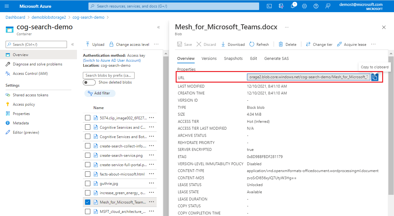 如果特定文档是 blob,请提供 blob URI。 可以在 Azure 门户的 blob 属性页中找到 URI。