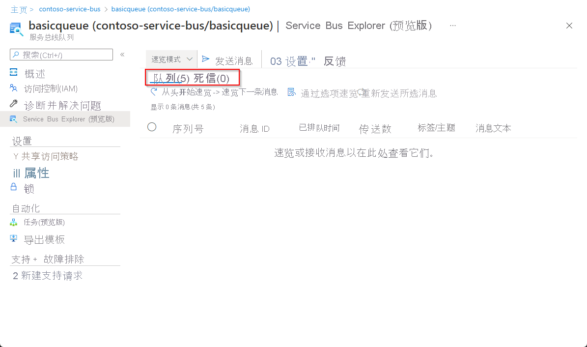 可以使用 Service Bus Explorer 中的速览功能来查看队列、订阅或死信队列中的前 100 条消息。
