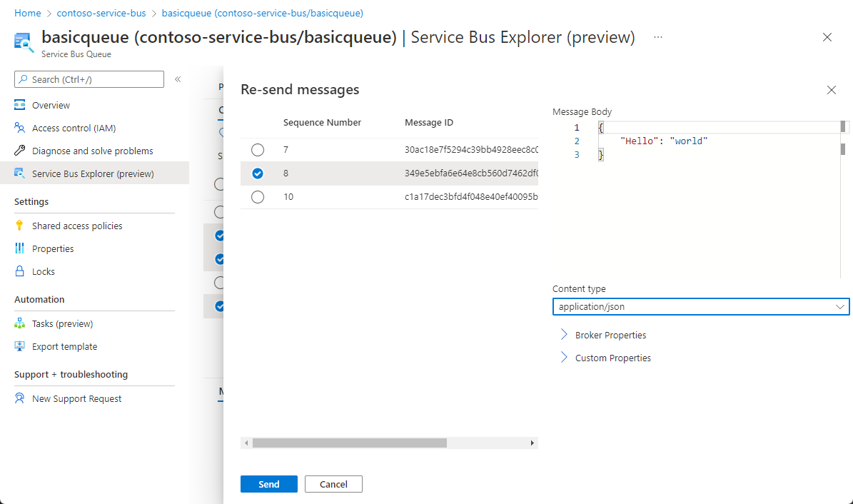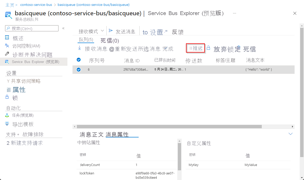 在速览或接收消息后,可以重新发送它,这会将消息的副本发送到同一实体,同时还支持我们更新其内容和属性。 即使从死信队列重新发送,原始内容仍保留且不会被删除。