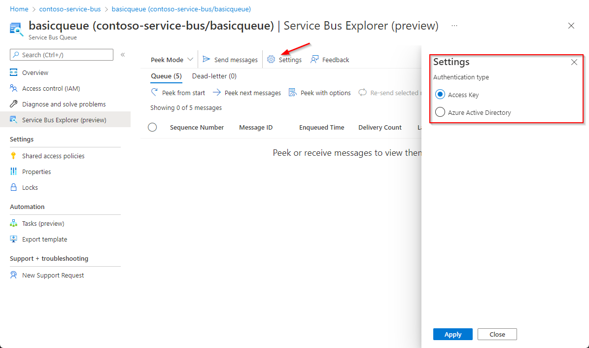 使用 Service Bus Explorer 时,可以使用“访问密钥”或“Microsoft Entra ID”身份验证。