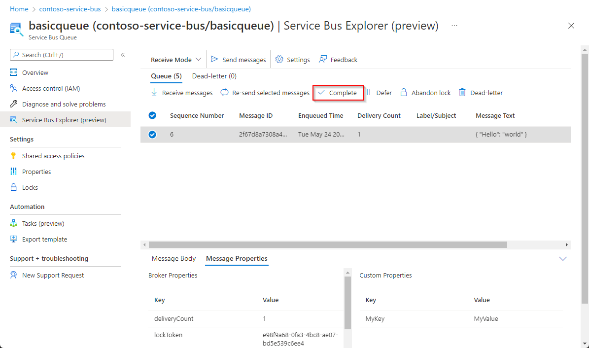 ReceiveAndDelete 模式是一种破坏性接收,即当消息显示在 Service Bus Explorer 工具中时,系统会将其从队列中删除。