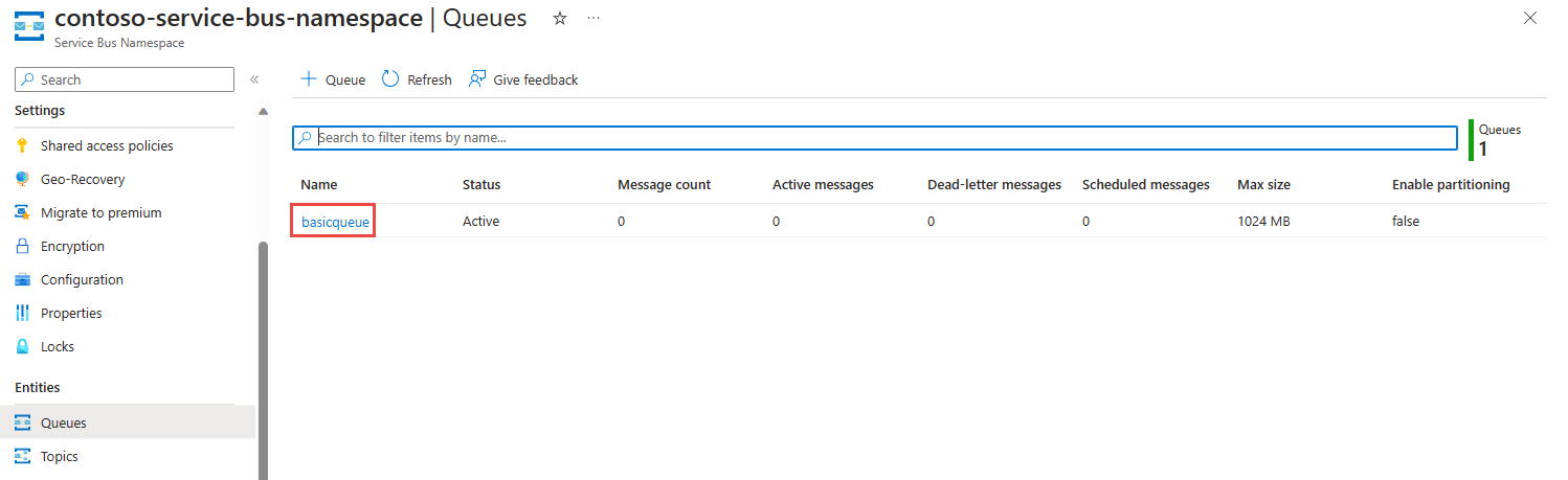 创建一个队列用于从中发送和接收消息,或者创建一个包含订阅的主题用于测试功能。 若要了解如何创建队列、主题和订阅,请参阅以下文章: