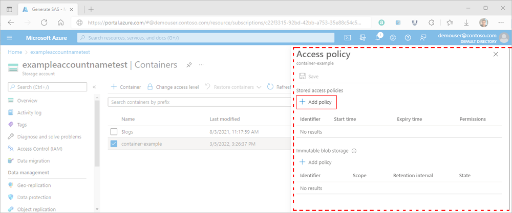 在 “访问策略 ”窗格中,选择“ + 添加策略 ”以定义其他策略,或选择“ 保存 ”将新策略应用到容器。 创建至少一个存储访问策略后,你将能够将其他安全访问签名(SAS)与其相关联。