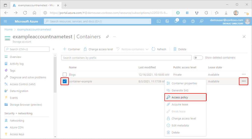选择容器的 “更多 ”按钮(...),然后选择 “访问策略 ”以显示 “访问策略 ”窗格。