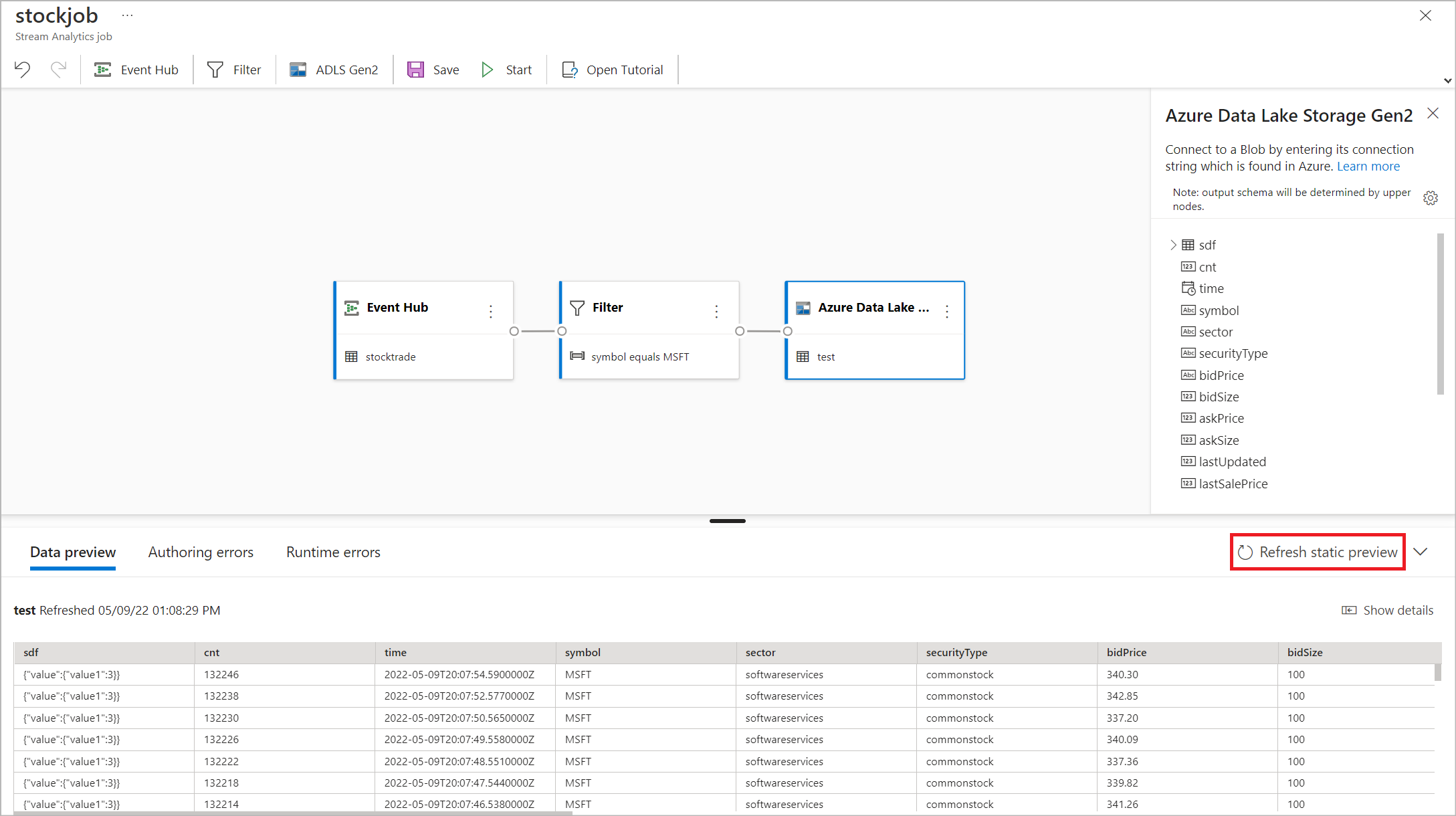 本文介绍如何使用无代码编辑器轻松创建流分析作业。 它不断从事件中心读取数据,筛选传入数据,然后将结果持续写入到 Azure Data Lake Storage Gen2。