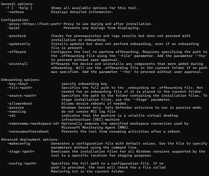 # Only absolute paths can be used for the parameters accepting paths # Configures the tool to perform offboarding. # Add the parameter "YES" to proceed with offboarding without user approval. # Offboard: False # Used with "Offboard" and "Uninstall" parameters. # Yes: False # Downloads the installation files for all Windows versions supported by the tool to a specific location for staging purposes. # Stage: # Specifies the path to the folder containing the installation files. To stage installation files, use the "Stage" parameter. # Source: # Specifies the full path to the .onboarding or .offboarding file if it is not placed in the current folder. # File: # Proxy to use during and after installation. Empty string by default. Proxy: # Prevents any dialogs from displaying. False by default. Quiet: False # Allows device reboots if needed. False by default AllowReboot: False # Prevents the tool from resuming activities after a reboot. False by default. NoResumeAfterReboot: False # Windows Server only. Sets Defender antivirus to run in passive mode. Passive: False # Installs updates but does not perform onboarding, even if an onboarding file is present. False by default. UpdateOnly: False # Displays detailed information. False by default. Verbose: False # Checks for prerequisites and logs results but does not proceed with installation or onboarding. False by default. Precheck: False # Offboards the device and uninstalls any components that were added during onboarding. # Will use the .offboarding file in the current folder if no path was specified. # Add the parameter "YES" to proceed without user approval. Uninstall: False # Optionally removes the specified workspace connection used by Microsoft Monitoring Agent (MMA). Empty string by default. RemoveMMA: # Allows offboarding to proceed even if there is no connectivity. False by default. Offline: False步骤 3:使用配置文件运行该工具。