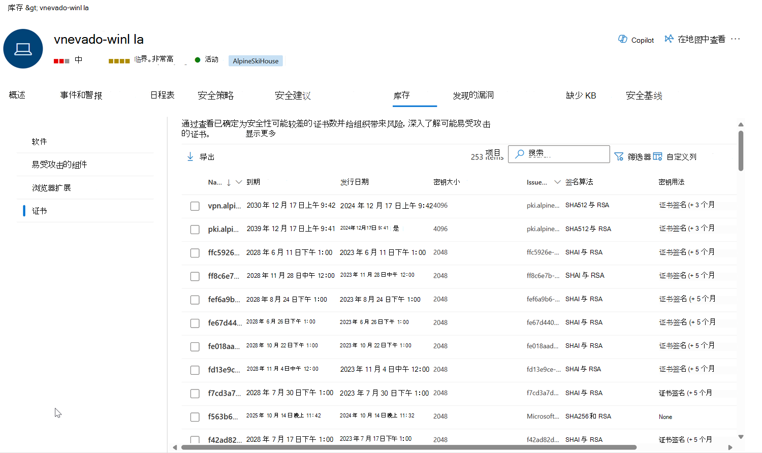 此时会打开 “证书清单 ”页,其中包含证书数的数据可视化效果的概述。 包含整个组织中安装的证书的列表,包括有关到期日期、密钥大小、证书颁发者和实例数的详细信息。