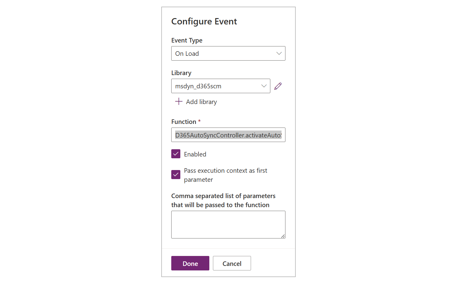 msdyn_d365scmis present. If it isn't, select Add library and add it.Open the On Load event for the custom form and add the handler function