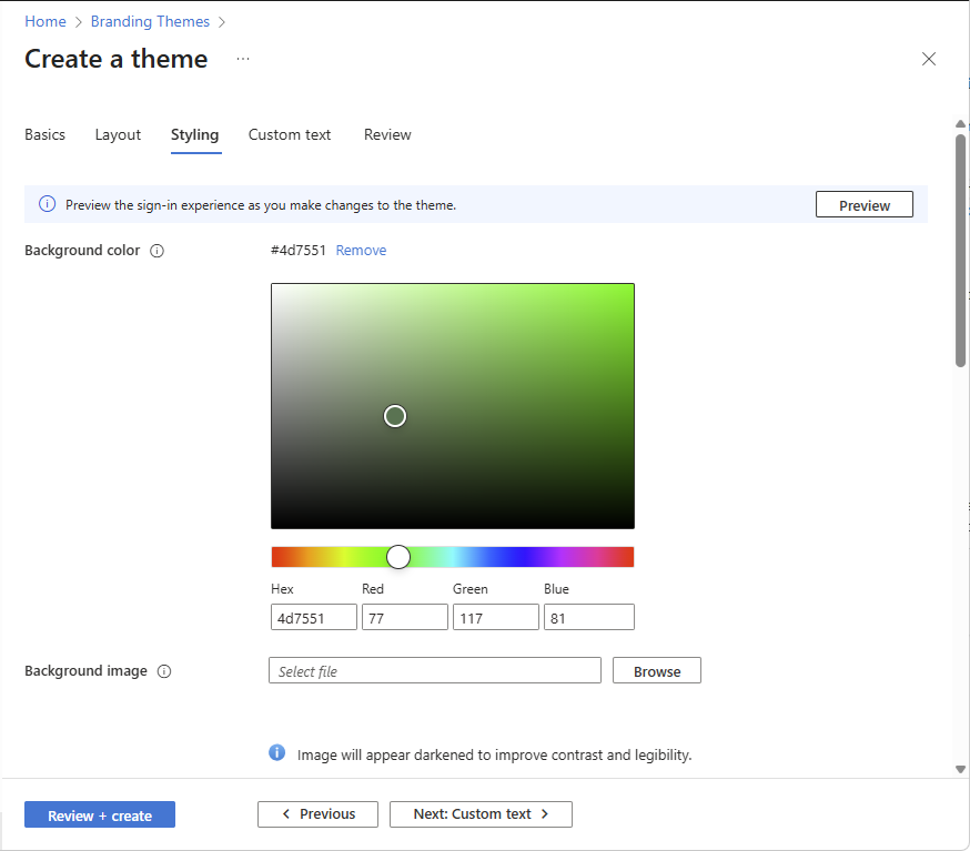 可以为租户中的应用程序创建唯一的身份验证体验。 每个应用程序都可以有自己的主题,可以使用背景图像或颜色、favicon、布局、页眉和页脚进行自定义。 此自定义将替代对默认品牌所做的任何配置。 如果未对元素进行任何更改,将显示默认元素。