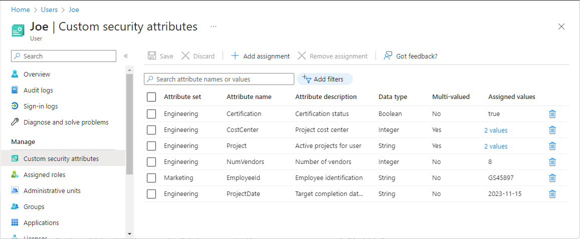 将自定义安全属性分配给适用于你的业务方案的 Microsoft Entra 对象。 了解详细信息