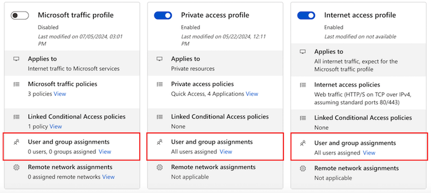 屏幕截图演示了该设置。 Microsoft 配置文件已被禁用且未分配到任何用户和组。 专用访问和 Internet 访问配置文件已启用且已分配到所有用户。